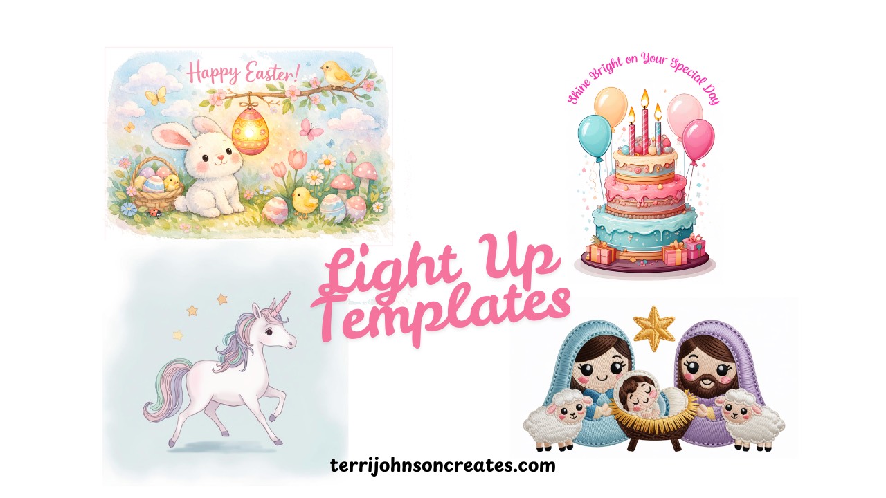 I’m thrilled to share this Light Up Card Template Bundle with you as a special gift. Inside you’ll find beautiful original PNG files to use with Pear Blossom Press lights